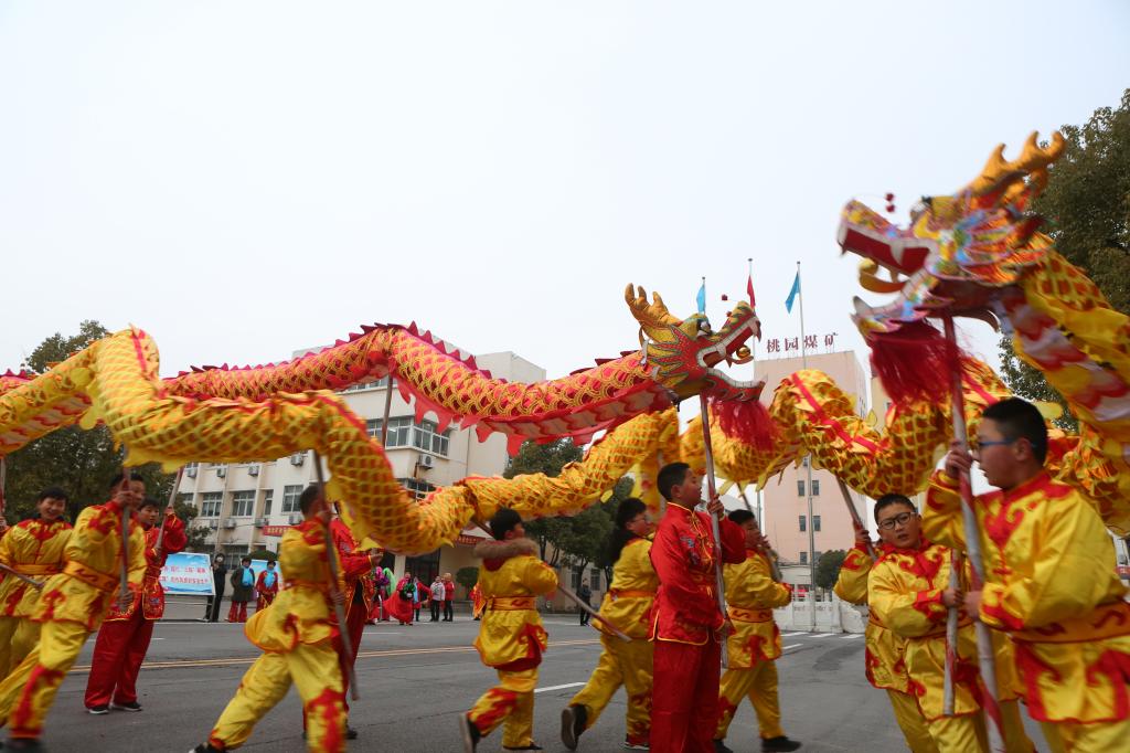 早上七點半,伴隨著陣陣威風鑼鼓聲,兩條舞龍在礦工業(yè)廣場上翻騰穿梭,上下游動,象征著淮礦集團艱苦創(chuàng)新業(yè),開拓爭一流的企業(yè)精神,寓意著該礦干群在新的一年里,將沿著一張藍圖繪到底,擼起袖子加油干的拼搏精神。