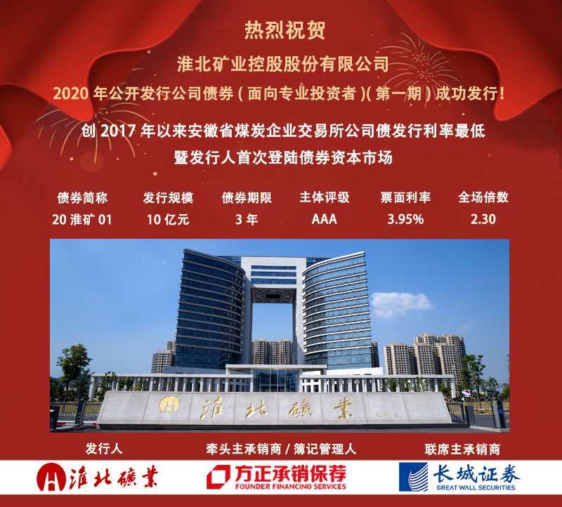 10月20日,淮北礦業(yè)2020年公開(kāi)發(fā)行公司債(面向?qū)I(yè)投資者)(第一期)成功發(fā)行,本期債券發(fā)行規(guī)模10億元,期限3年,票面利率3.95%,認(rèn)購(gòu)倍數(shù)2.3倍。