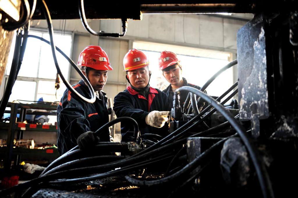 杲志(中間)在為職工講解鉆機(jī)維修知識(shí)