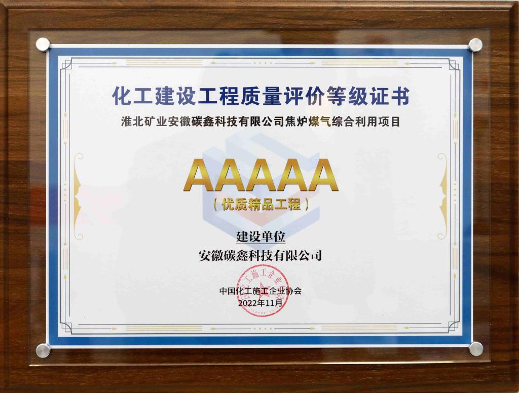 近日,2022年化工建設工程質量評價結果出爐,安徽碳鑫科技有限公司焦爐煤氣綜合利用項目獲評2022年全國化工行業工程質量建設的最高榮譽——5A級優質精品工程。