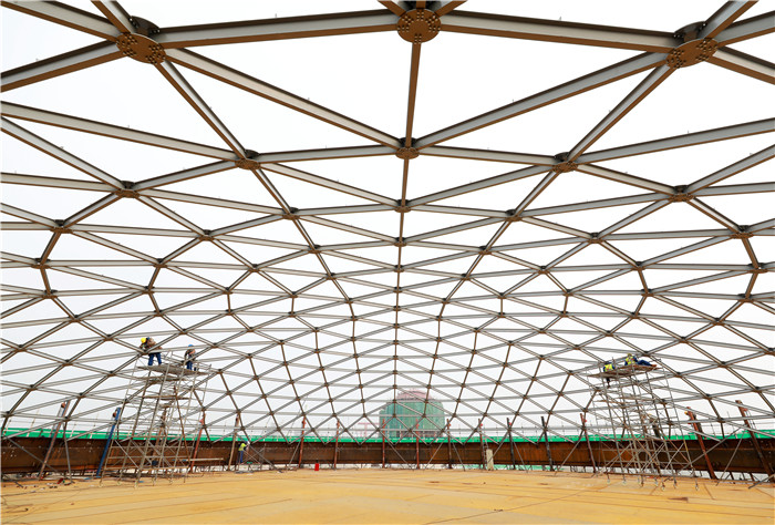 碳鑫科技公司20000立方米的乙醇成品罐,正進行罐頂部網殼拼裝。王明明攝