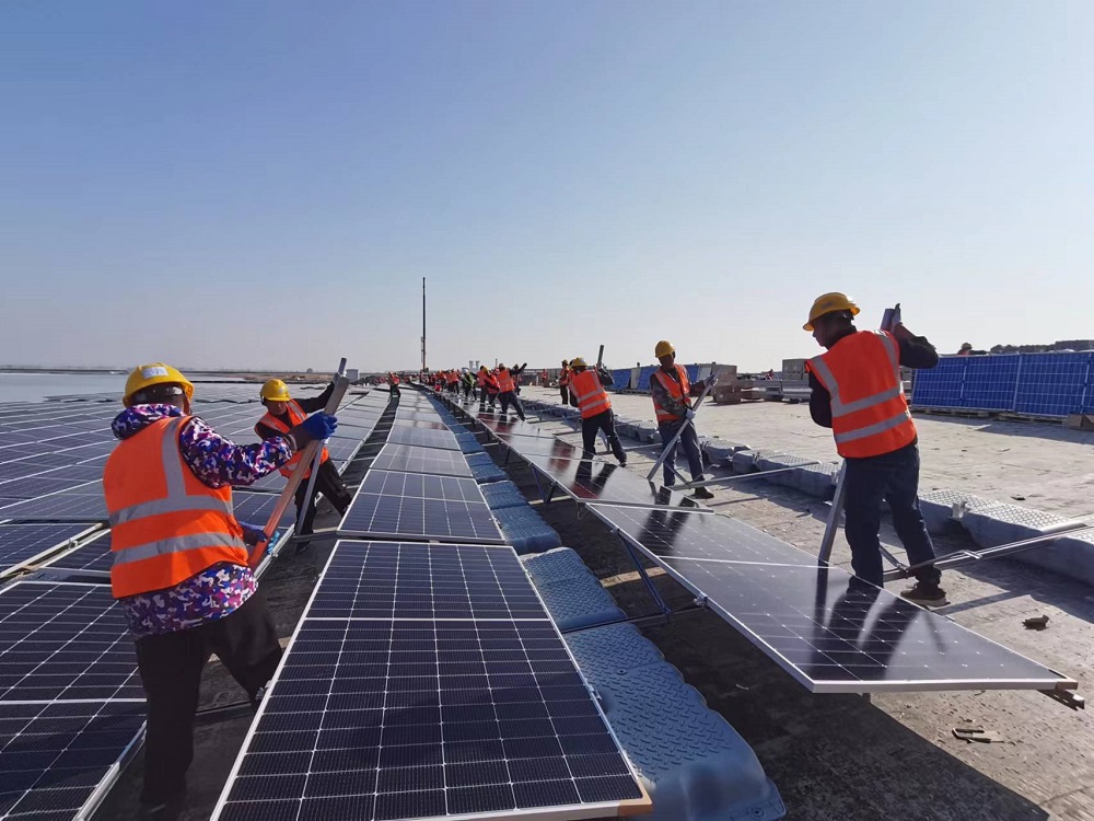 淮北礦業集團加快發展光伏“綠電”戰新產業補鏈項目。在面積達94公頃的袁店一礦84兆瓦集中式水面光伏項目現場,120名職工分成6個班組,從南北兩岸正加快施工。“項目建成后,平均每年提供綠色電能9311萬千瓦時,相對火力發電,每年節省標煤2.84萬噸,相應減少排放二氧化碳7.58萬噸。”該光伏項目建設負責人秦忠原介紹。