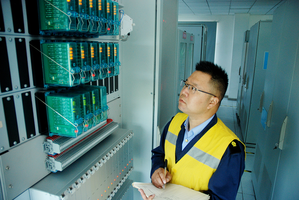 圖為臨渙電務(wù)段信號(hào)領(lǐng)工區(qū)領(lǐng)工長石磊查看信號(hào)聯(lián)鎖機(jī)房信號(hào)集中監(jiān)測系統(tǒng)運(yùn)行情況