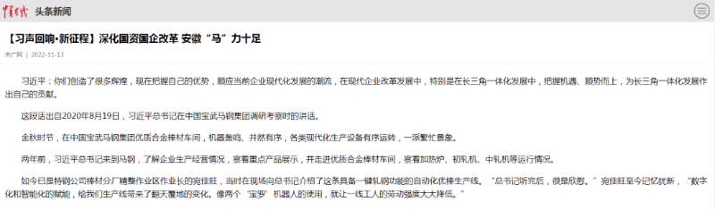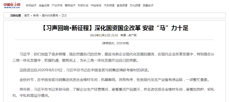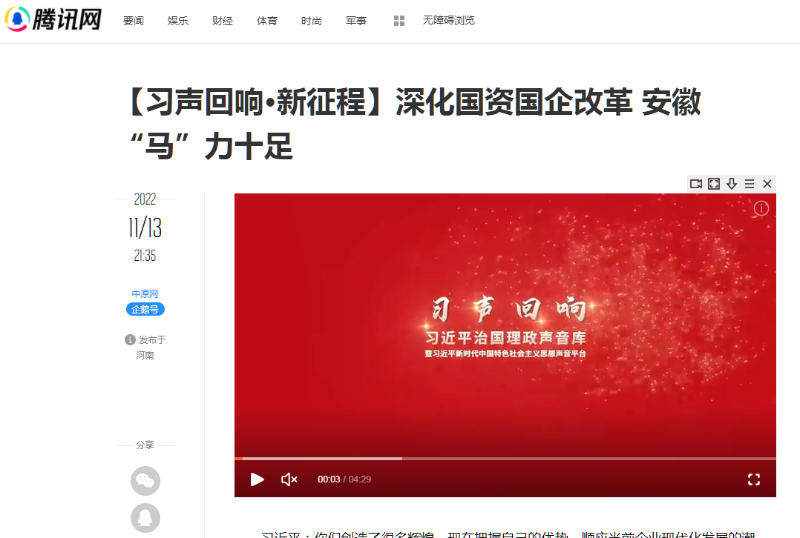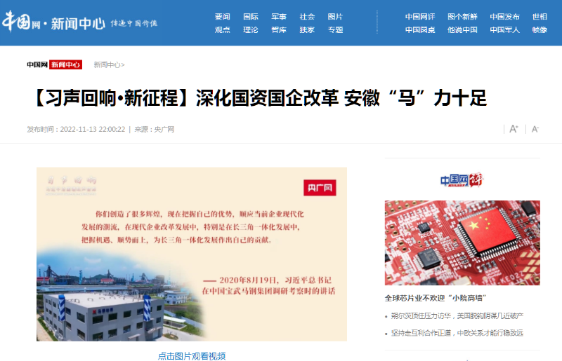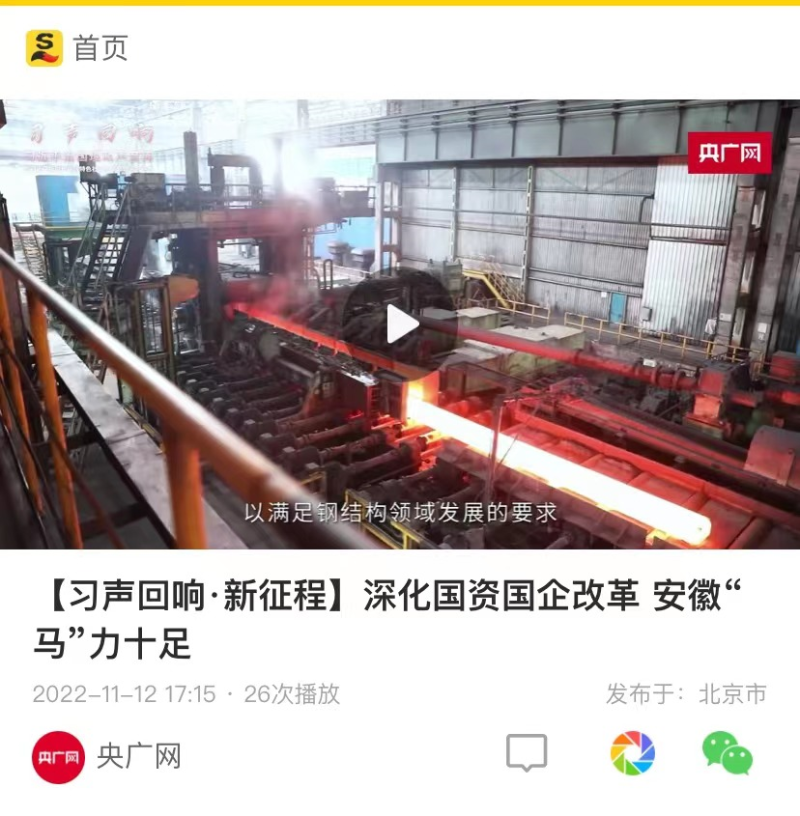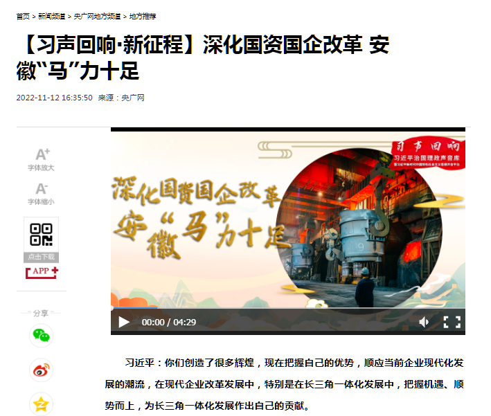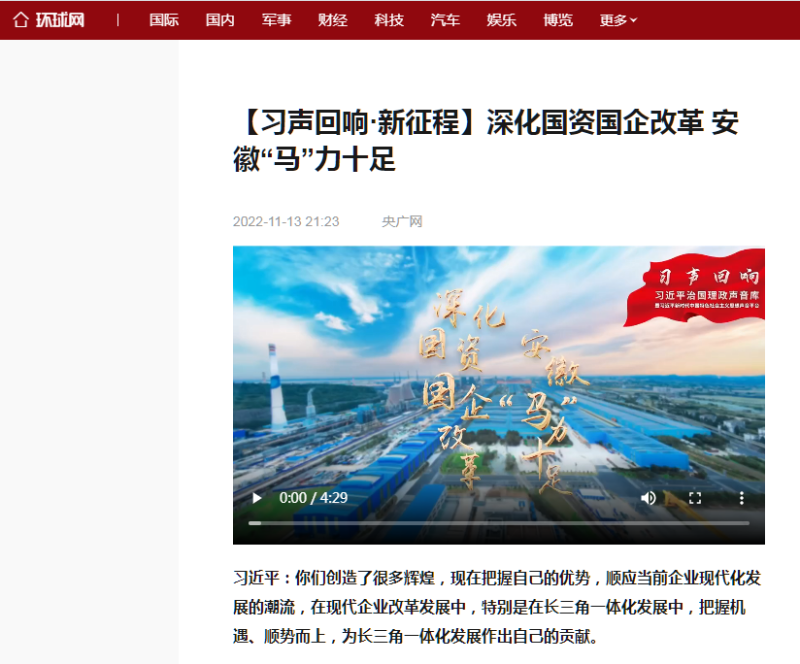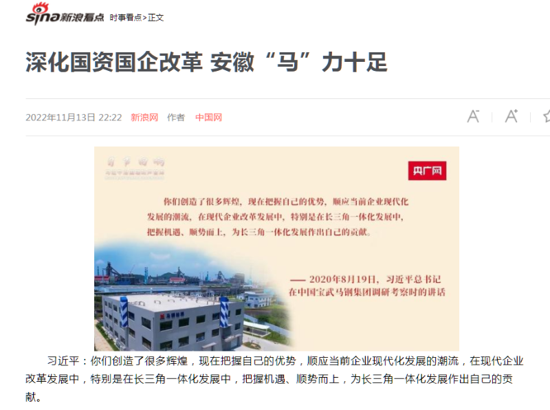 搶抓發(fā)展機遇,敢為時代先鋒。國企改革三年行動以來,安徽國資國企深化改革創(chuàng)新,不斷轉(zhuǎn)型突破,推動省屬企業(yè)高質(zhì)量發(fā)展邁上新臺階。2021年,安徽省屬國有企業(yè)經(jīng)營業(yè)績創(chuàng)歷史最好水平。今年上半年,省屬企業(yè)資產(chǎn)總額首次突破2萬億元。目前,安徽省國企改革三年行動的129項重點任務(wù)已基本完成。央廣網(wǎng)、人民網(wǎng)、中國網(wǎng)、中華網(wǎng)、光明網(wǎng)、環(huán)球網(wǎng)、中國經(jīng)濟網(wǎng)、中國青年網(wǎng)、中青在線、新浪網(wǎng)、網(wǎng)易網(wǎng)、騰訊網(wǎng)、搜狐網(wǎng)、鳳凰網(wǎng)等15家全國主流媒體及30余家省級主流媒體對此進行了集中報道。