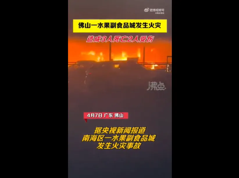 2022年4月7日凌晨1時許,廣東省佛山市南海區(qū)獅山鎮(zhèn)羅村華南水果副食品城發(fā)生火災(zāi)事故。事故共造成3人死亡,2人受傷。